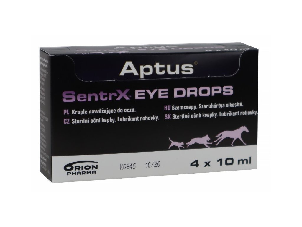Aptus SentrX oční kapky je lubrikant rohovky obsahující biopolymery - modifikovanou zesíťovanou kyselinu hyaluronovou. Poskytuje dlouhotrvající zvlhčení a lubrikaci oční rohovky, čímž potlačuje symptomy tzv. “suchého oka” (KCS, keratokonjunctivitis sicca). Tyto oční kapky jsou určeny pro psy se syndromem tzv. “suchého oka”, a pro všechny ostatní případy vyžadující zvlhčení a lubrikaci oční rohovky. Cílový druh zvířete: pes, kočka, kůň.