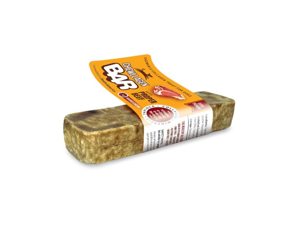 Odolná žvýkací tyčinka Chewllagen BAR Beef je speciálně navržená pro podporu zdraví kloubů, mobility a celkové pohody psů. Obsahuje vysoce kvalitní hydrolyzovaný kolagen, který hraje klíčovou roli při udržování zdraví pojivových tkání – tedy kloubů, kůže a šlach. Bezobilná (grain-free), bezlepková tyčinka je navíc obohacená o důležité vitamíny (A, C, E, D3, K3, B1, B2, B6 a B12) a minerály, neobsahuje žádný přidaný cukr ani GMO a má nízký obsah tuku, což z ní činí ideální pochoutku i pro psy se sklonem k nadváze.