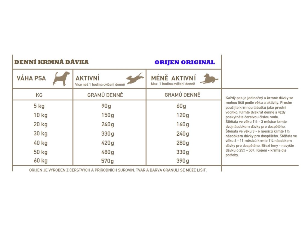 ORIJEN ORIGINAL obsahuje vysoký podíl proteinů z volně chovaných kuřat a krůt, ryb lovených v prírodních vodách a vajec z hnízdních chovů. Všechny suroviny jsou nám dodávány čerstvé nebo syrové v bohatě výživném podílu Celé kořisti. Plná nepřekonatelné přírodní chuti zaručí naše vítězně oceňovaná krmiva ORIJEN, že váš pes bude zdravý, spokojený a silný.