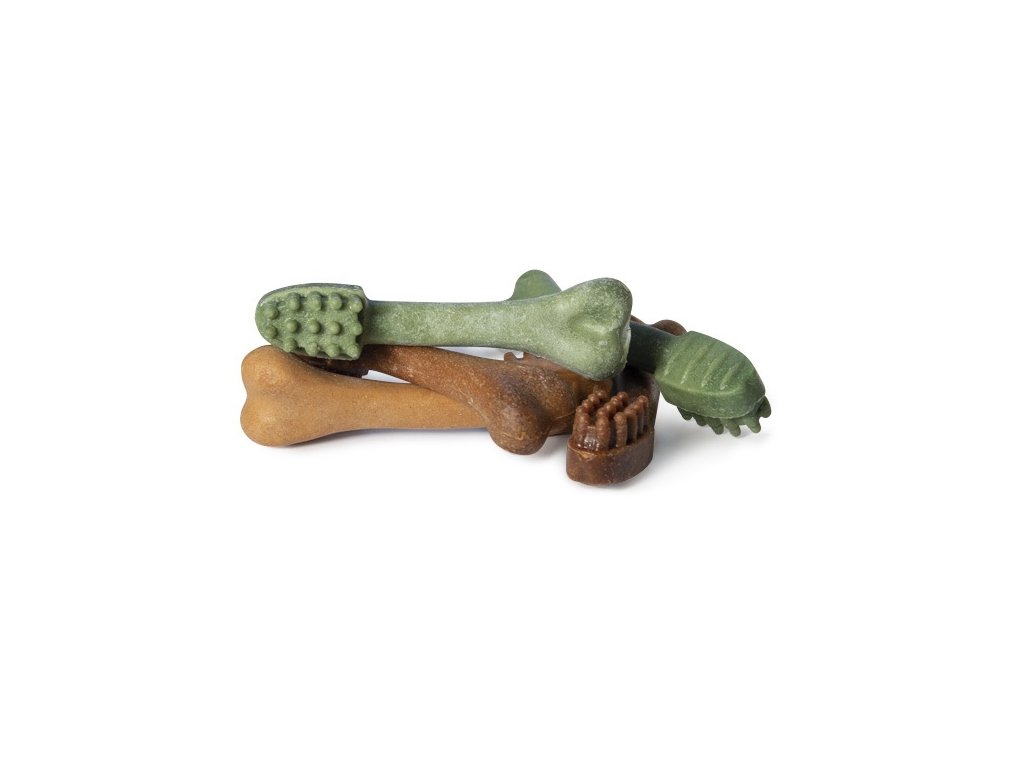Dentální pochoutka pro menší a středně velké psy ve tvaru zubního kartáčku. Vynikající vegetariánský pamlsek, který voní po mase, skvěle chutná a pečlivě vyčistí zuby i jazyk vašeho pejska. Napomáhá bojovat proti zápachu z tlamy. Konzistence je tuhá, ne tříštivá, podporuje tak žvýkání. Doporučujeme podávat jednu pochoutku jako odměnu za den. Nevhodné pro psy mladší 9 měsíců a menší než 2,25 kg. Váš pes musí mít k dispozici vždy dostatek čerstvé vody.